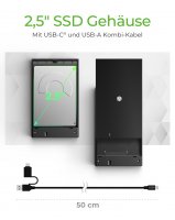 Externes USB 3.2 Gen 1 Type-C® Gehäuse für eine 2,5" SSD | Werkzeuglose Festplattenmontage | Datentransferrate bis zu 5 Gbit/s | USB 3.2 Gen 1 Type-A/Type-C® Kombi-Kabel | Bauhöhe der SSD bis zu 9,5 mm | Kompatibel mit Windows® macOS® und Chrome OS™